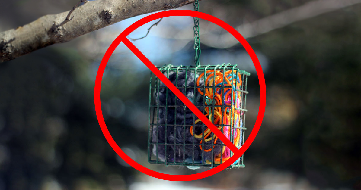 Yarn, thread, and string can get wrapped around birds legs, cutting off circulation or even trapping them to their own nests. When baby birds are born, it can get wrapped around their necks, strangling them, or wrapped around their legs or wings, causing them to lose those limbs.