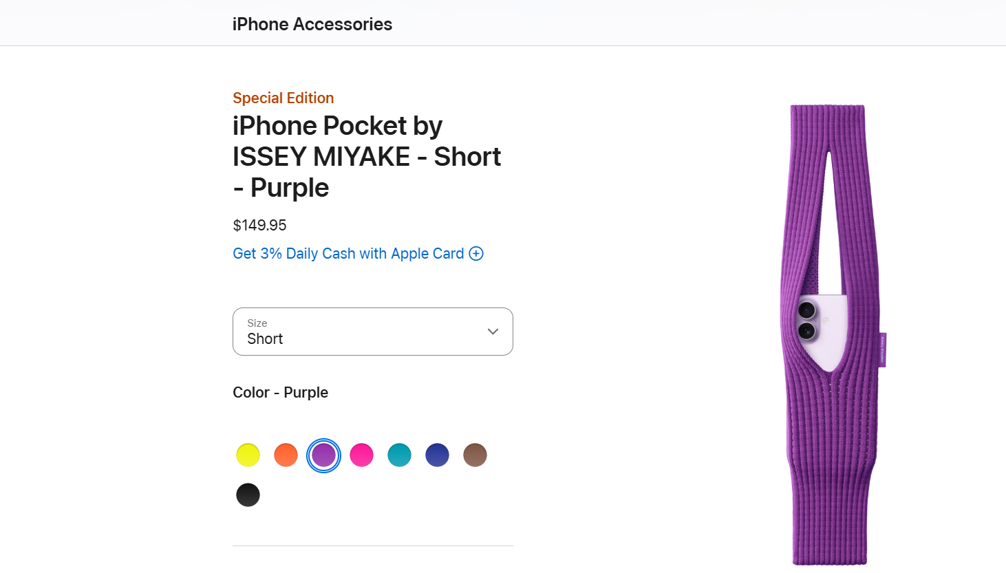 Apple recently announced their newest iPhone accessory which became available in select stores this last November. It’s called the iPhone Pocket and it’s a thin cloth bag for carrying your iPhone. The press release says that this was a collab with Miyake Design Studio, a fashion label known for technology-inspired design. The Pocket is made of ribbed knit cloth to hold any size iPhone (a departure from the usual need to repurchase all your iPhone accessories every time you upgrade to fit the new phone’s size). It sells for $124.99 USD for the short version or $223.99 USD for the long version.