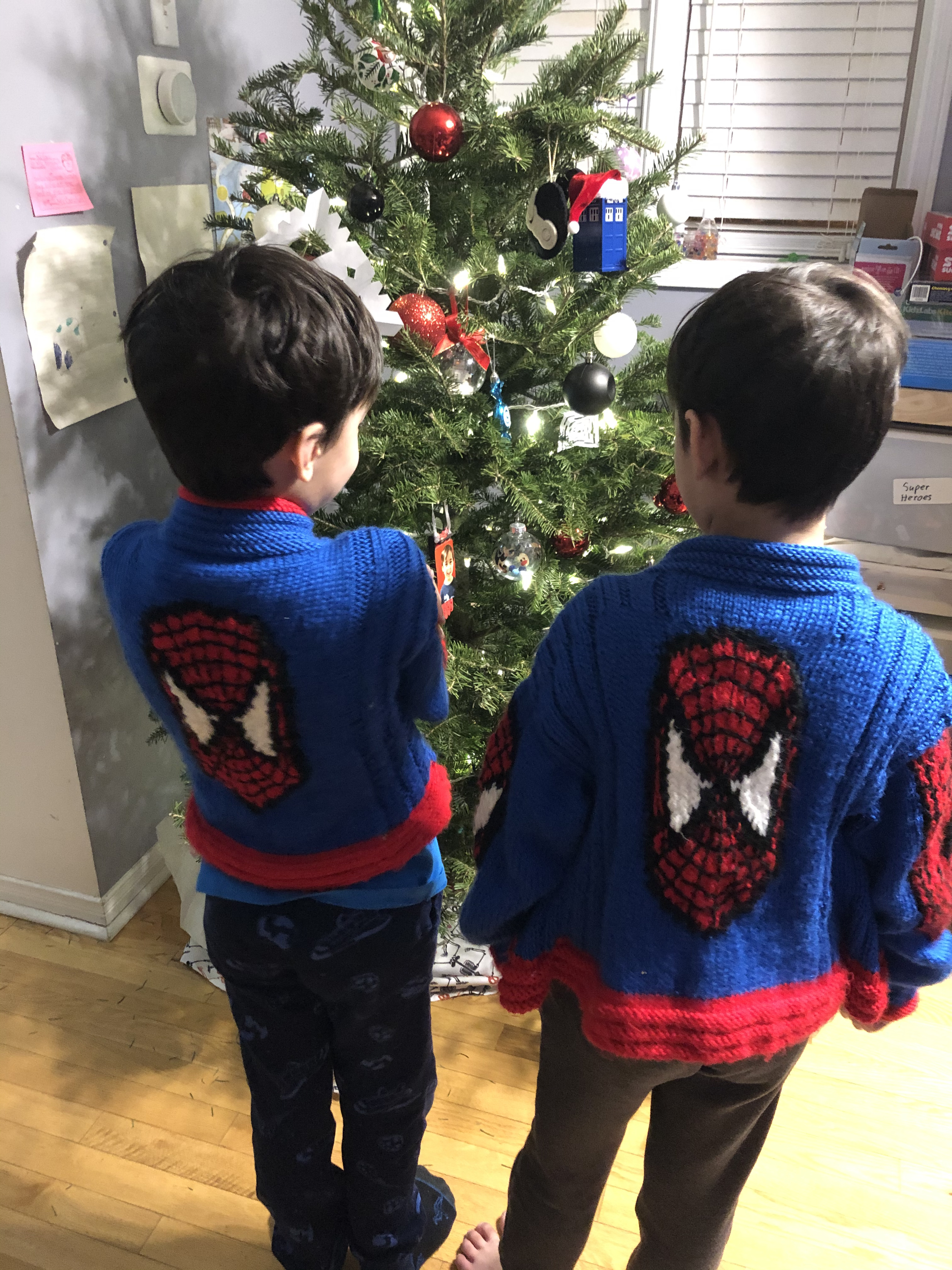 My grandmother is the one who taught me how to knit when I was 7 years old. It’s always been something to connect us. Whenever I’m home for a visit, she always asks me what I’m working on and shows me hers. She calls me for help deciphering modern patterns and we constantly argue over whether or not to make a gauge swatch. So it was no surprise when she knit a matching pair of newborn sweaters when I had my twins. This tradition has continued since then. Every year she knits them a pair of matching sweaters to wear for their Santa photo, and even though they are too old for Santa photos they still get their annual Christmas sweater.